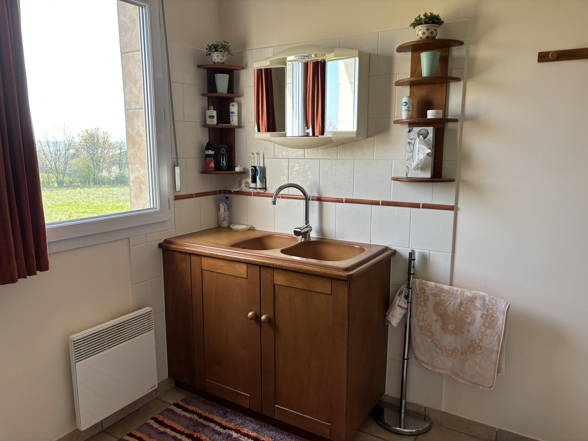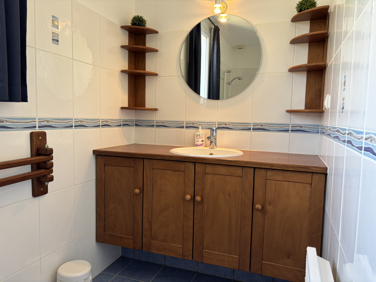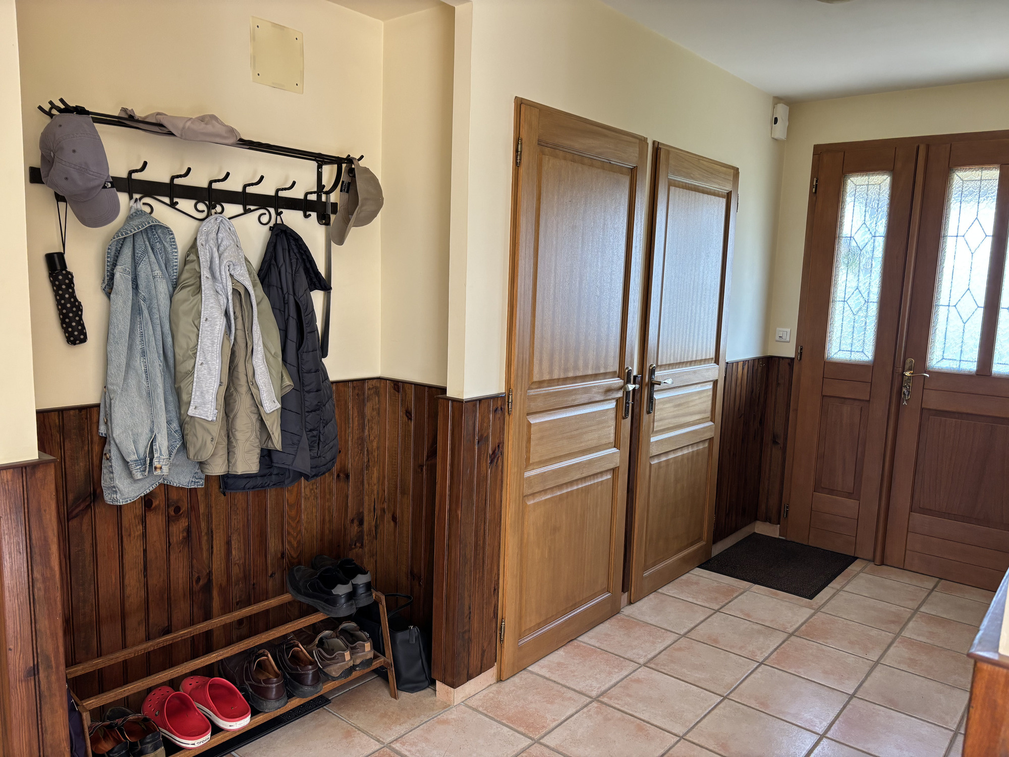 En entrant par le côté de la maison, vous accédez à un hall spacieux, d'où vous pouvez rejoindre des toilettes séparées et la première salle de bains équipée d'une baignoire et d'un lavabo.