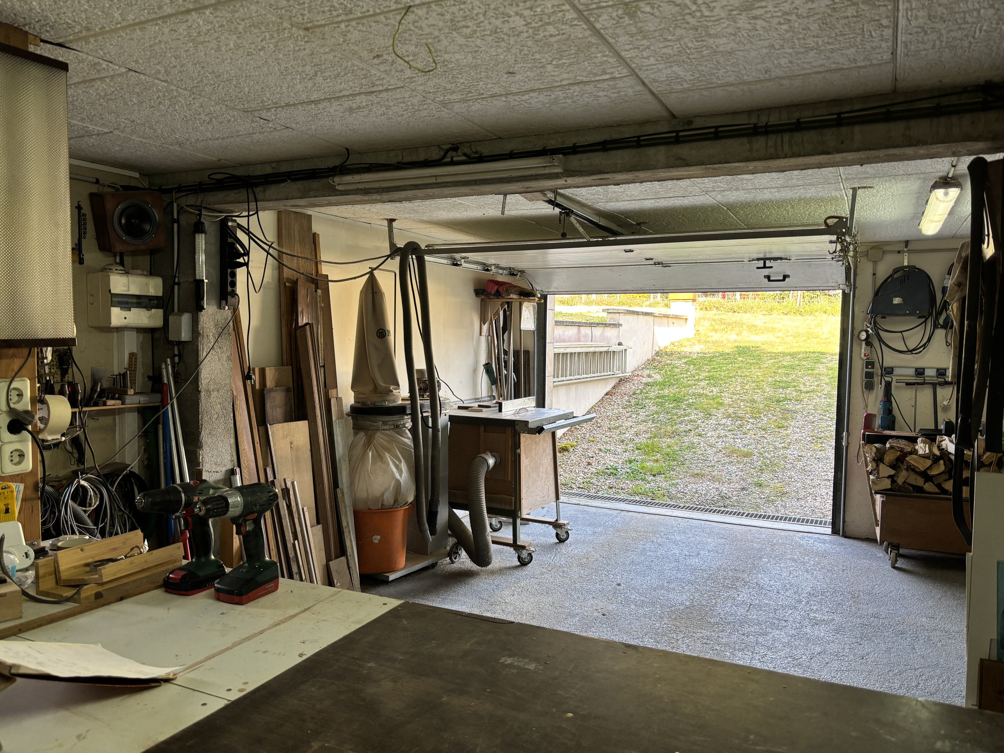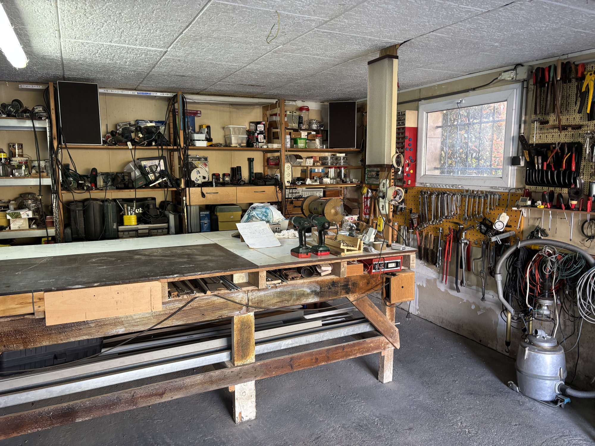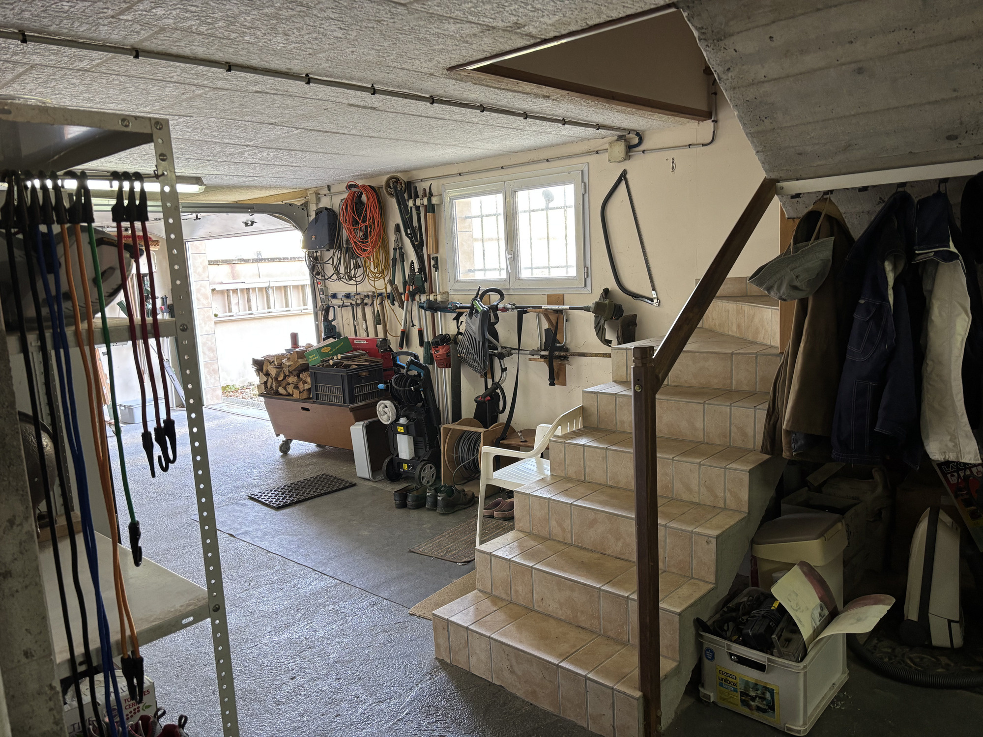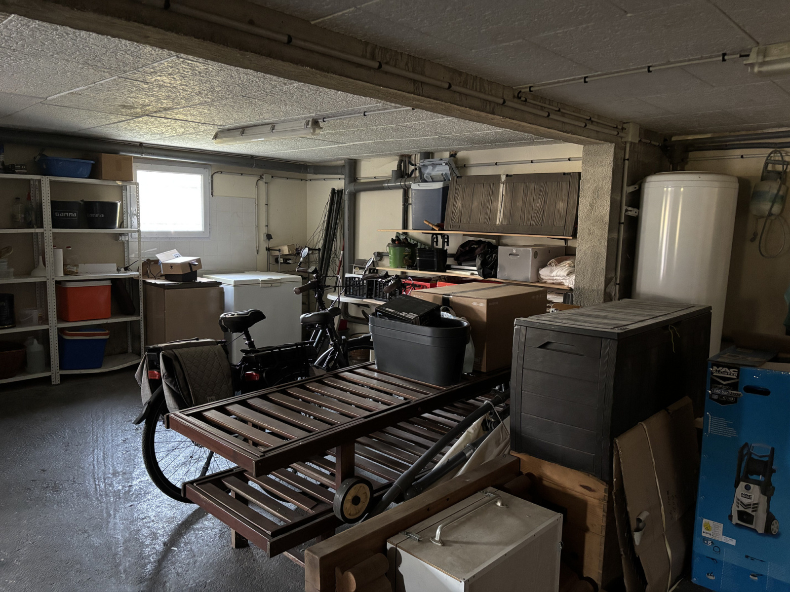 Le sous-sol occupe toute la surface de la maison, soit environ 88 m², et comprend une porte de garage, un espace atelier, le chauffe-eau et un lavabo.