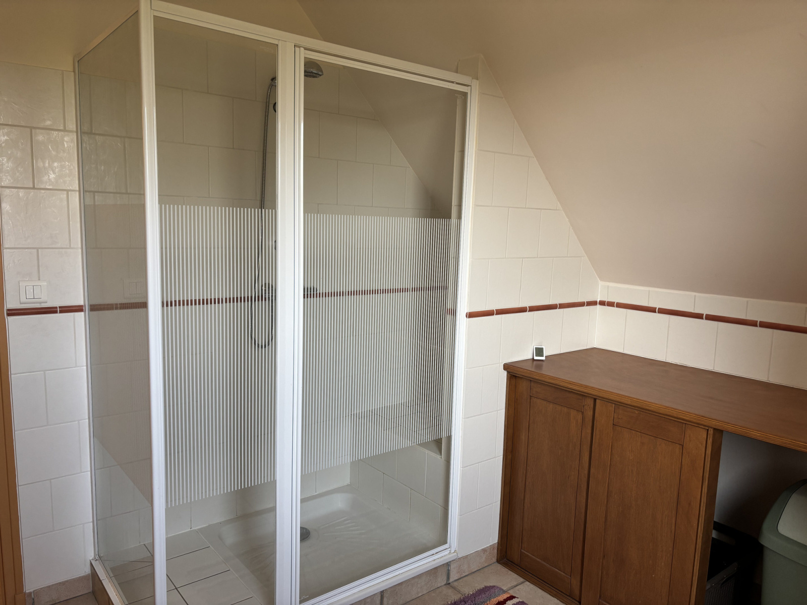 À l'étage supérieur, vous arrivez sur un palier lumineux et spacieux. On y trouve trois chambres spacieuses baignées de lumière. La chambre du milieu dispose d'armoires encastrées et d'une baie vitrée coulissante avec moustiquaire donnant accès à un balcon. Il y a également des toilettes séparées avec ventilation et une deuxième salle d’eau spacieuse équipée d'une douche, d'un lavabo et d'un raccordement pour une machine à laver. Les volets roulants de cet étage sont en partie électriques et en partie manuels.