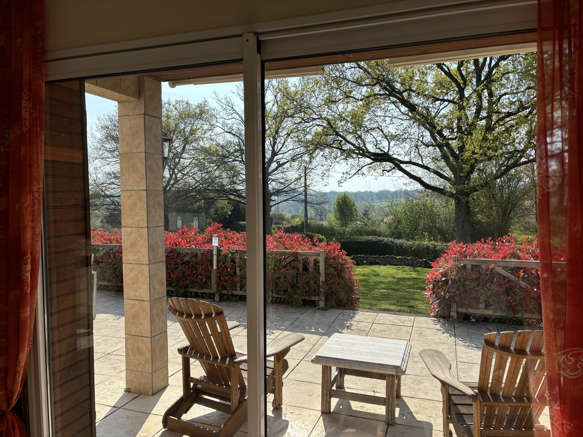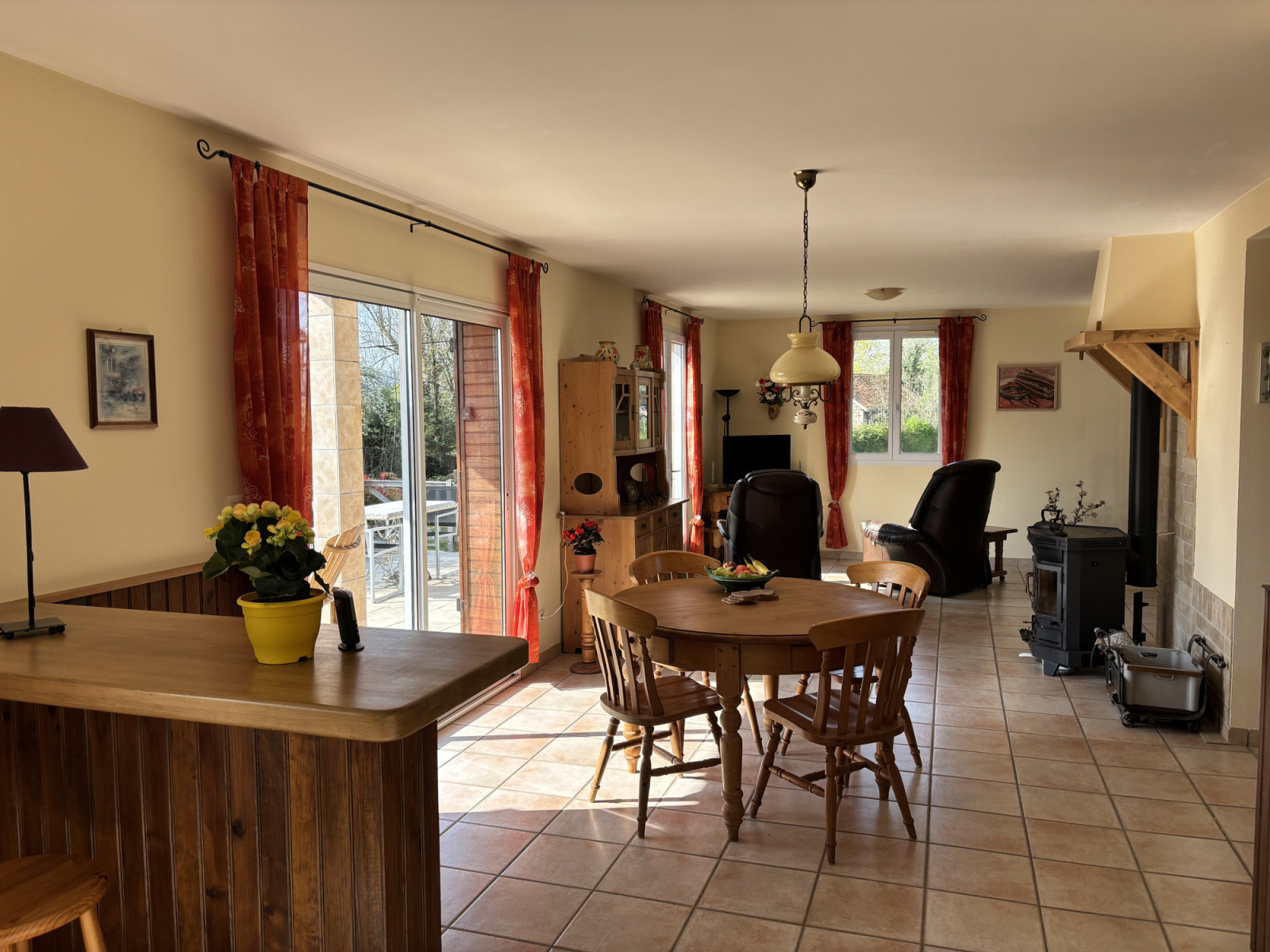 Depuis le hall d'entrée, vous accédez à la spacieuse pièce à vivre, qui est divisée en plusieurs espaces conviviaux. On y trouve notamment une cuisine ouverte équipée d'un lave-vaisselle encastré, d'un réfrigérateur, d'un four et de plaques de cuisson électriques, avec des portes-fenêtres donnant sur la terrasse à l'avant de la maison. À côté se trouve un premier coin repas avec une baie vitrée coulissante donnant sur la terrasse et un coin salon également doté de portes-fenêtres donnant sur l'extérieur. De l'autre côté de l'espace de vie, un deuxième coin repas a été aménagé. De là, vous avez accès au sous-sol et à l'escalier en bois menant à l'étage supérieur. L'ensemble de l'espace est chauffé par un poêle à bois et équipé d’un chauffage électrique au sol.