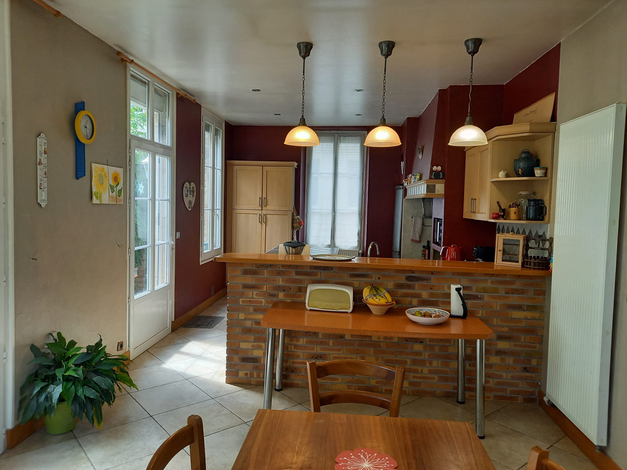 Concernant la maison principale : Une entrée de 13 m² (carreaux de ciment ) permet d'accéder à un grand salon et un bureau (60 m² avec deux cheminées), parquet chêne d'origine , toilettes et lavabo, une pièce de rangement, une chambre de 16 m² avec cheminée et placard , une cuisine équipée de 34 m² avec îlot central (boiseries murales) et un accès au terrain.