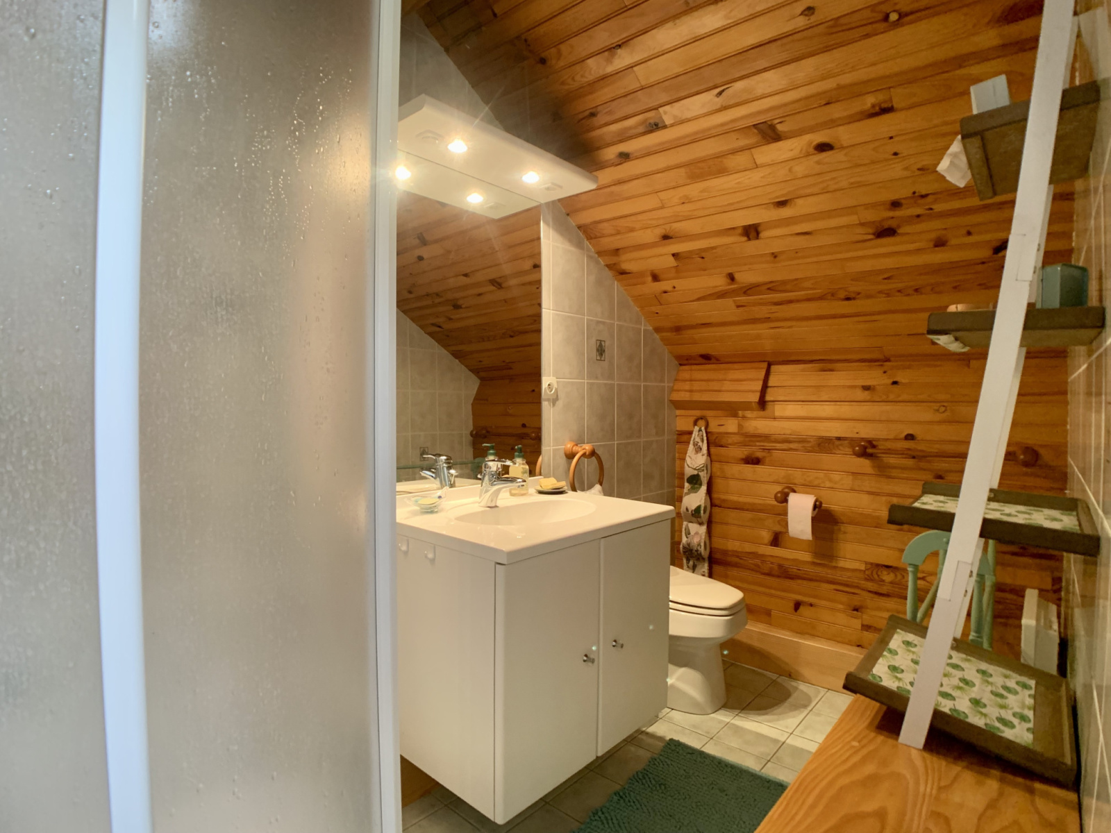 A l'étage, trois chambres et deux salles de bains offrent une atmosphère chaleureuse grâce au bois et la vue sur la nature.