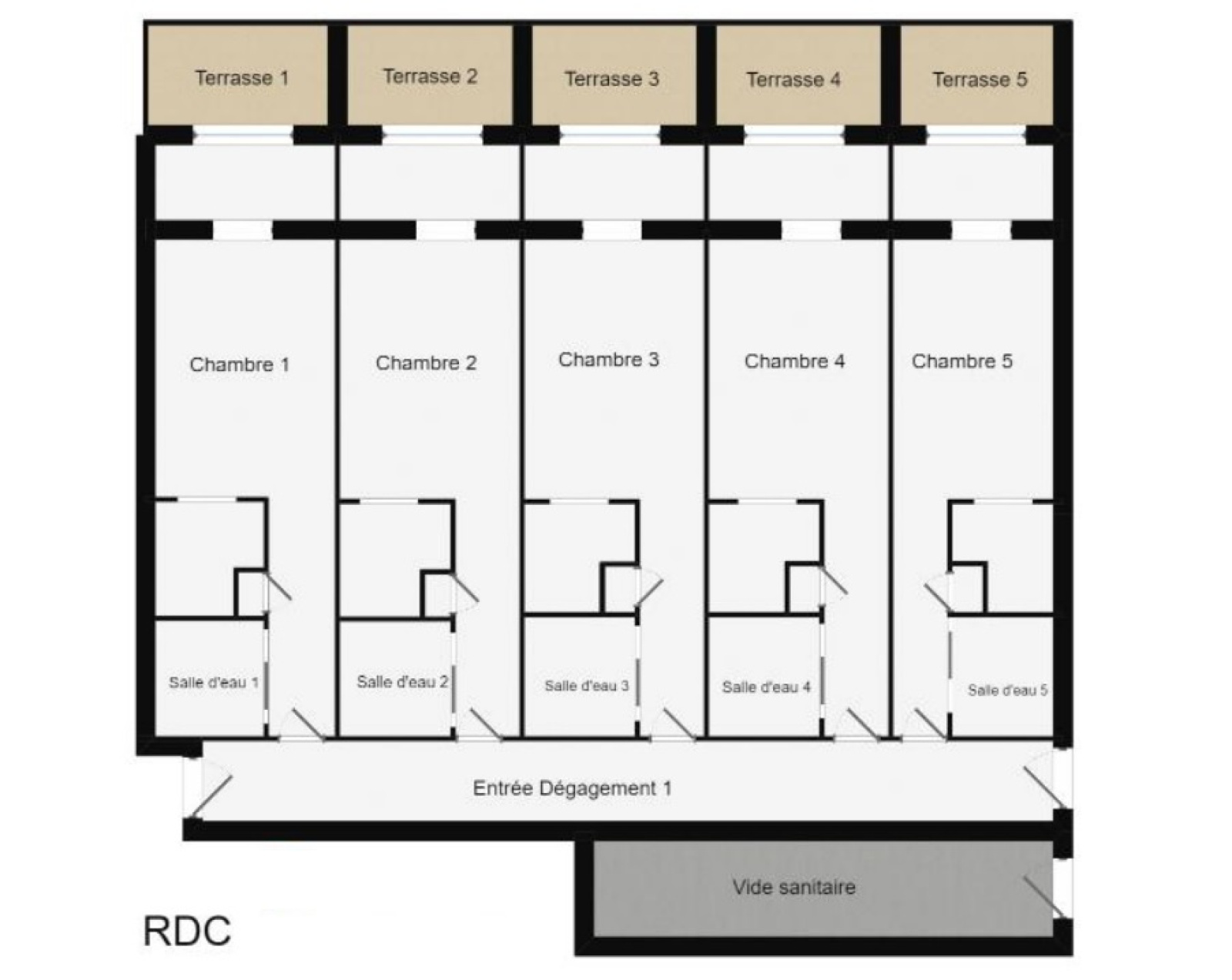 . au rez-de-chaussée : 5 studios de 24m² comprenant chacun, un séjour avec cuisine équipée ouverte, une salle d'eau avec wc, et une terrasse privative de 6.50m² + jardinet.