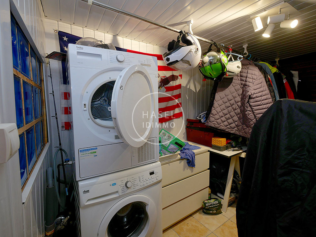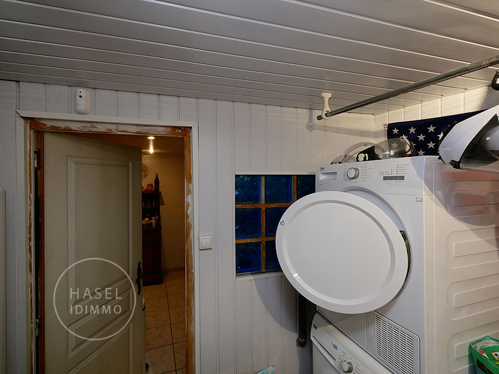 Le salon au rez de chaussé réunira famille et amis pour vos soirées, au besoin autour d’une cheminée. Le garage assure la maintenance avec lave-linge et sèche-linge.