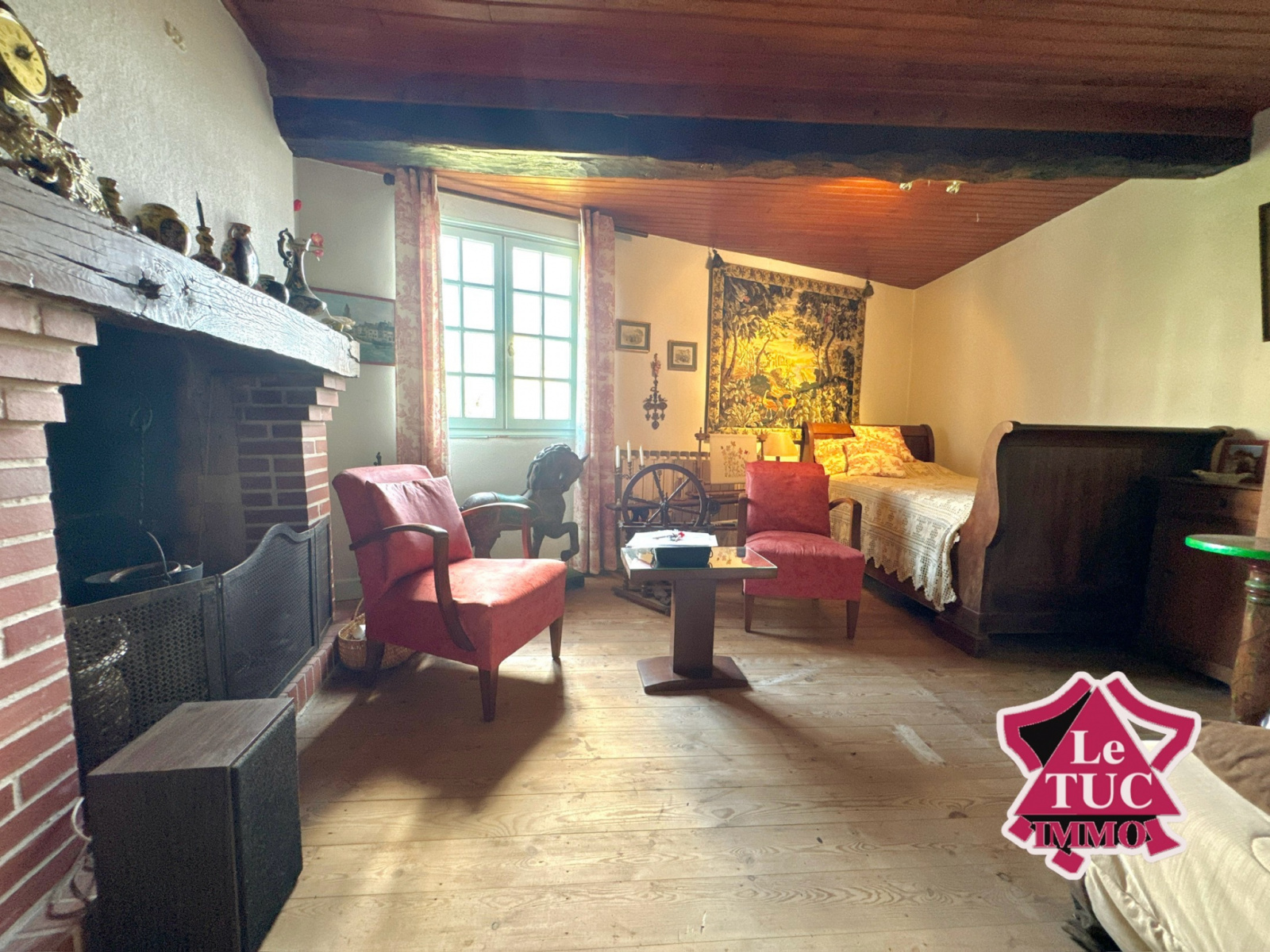 La maison possède beaucoup de charme, poutres apparentes, plancher authentique et deux cheminées anciennes.