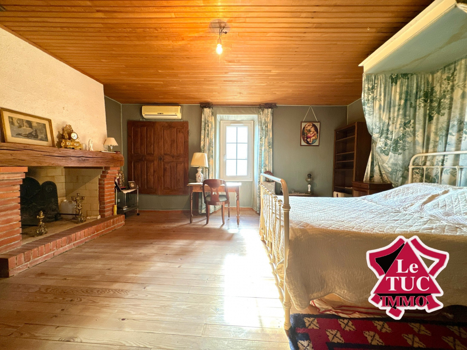À l’étage, deux chambres confortables, une de 13,70 m², et l’autre de 24,38 m² avec clim réversible et cheminée, ainsi que des WC indépendants avec vasque.