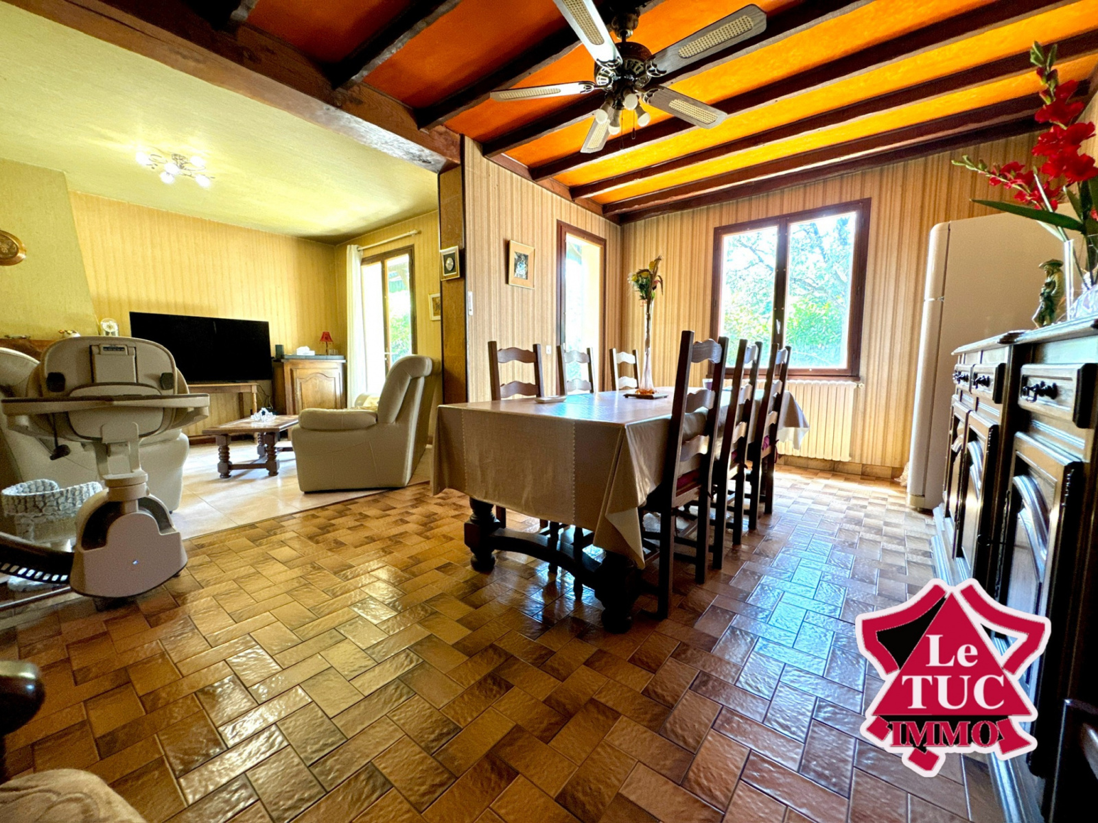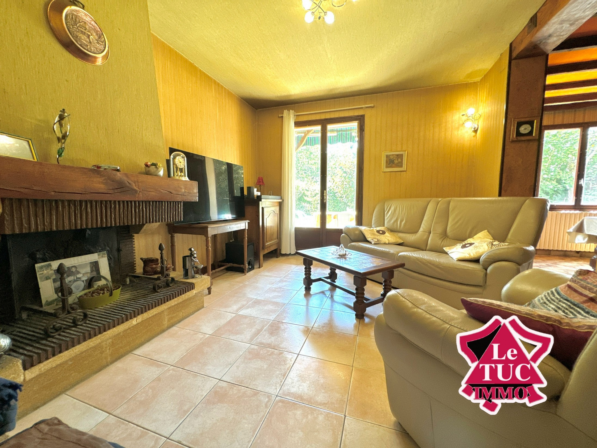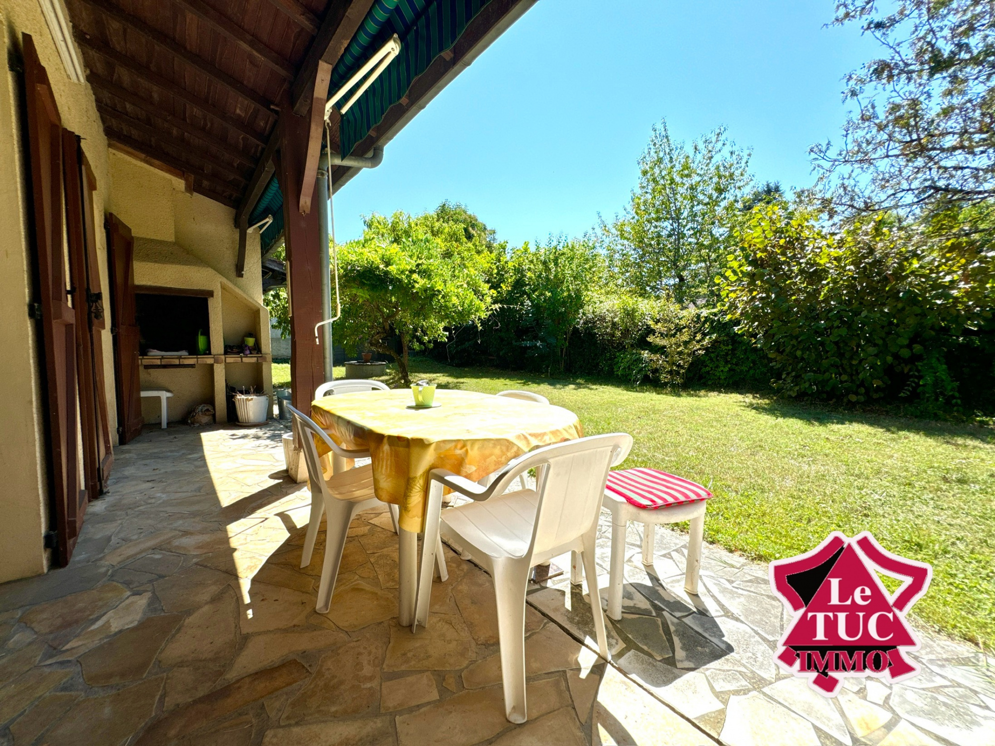 La pièce de vie se compose d’un salon avec cheminée et salle à manger ouverte de 40 m² donnant sur une terrasse couverte avec coin barbecue, sur un très joli jardin d’environ 250 m² avec un accès sur la rue par un portail.