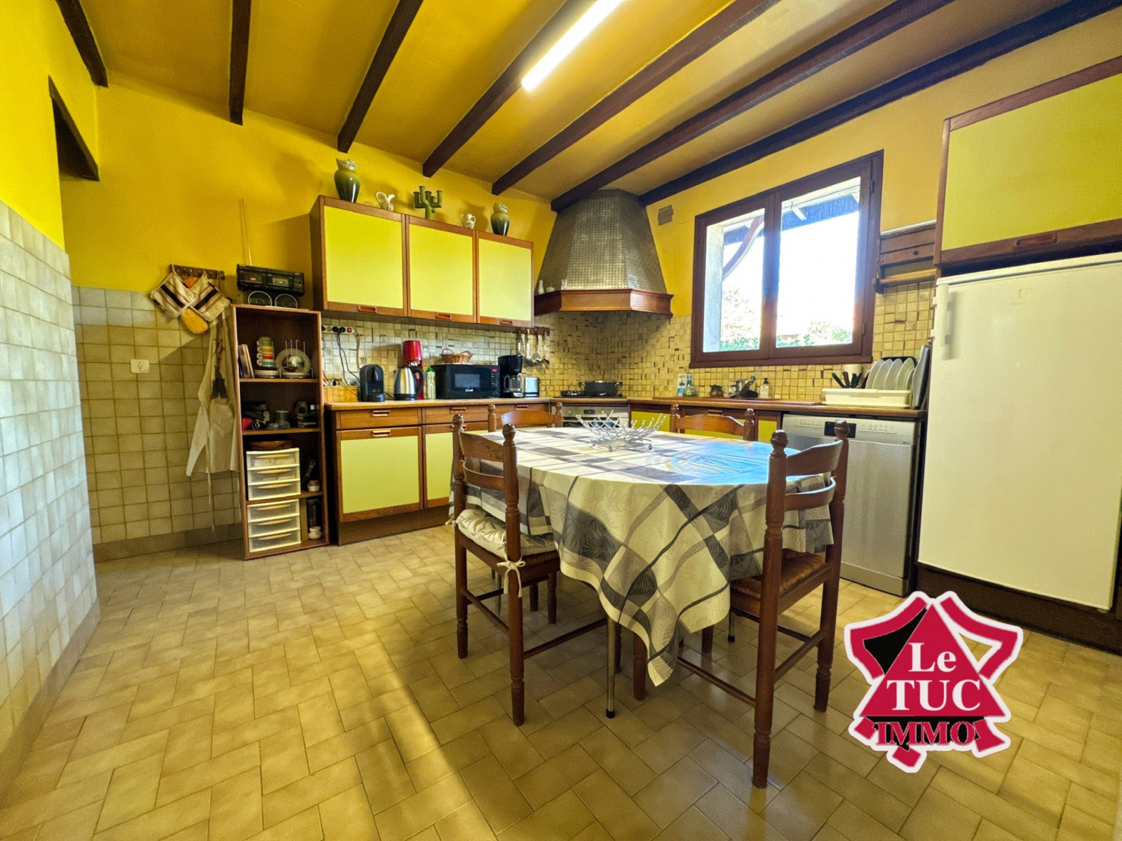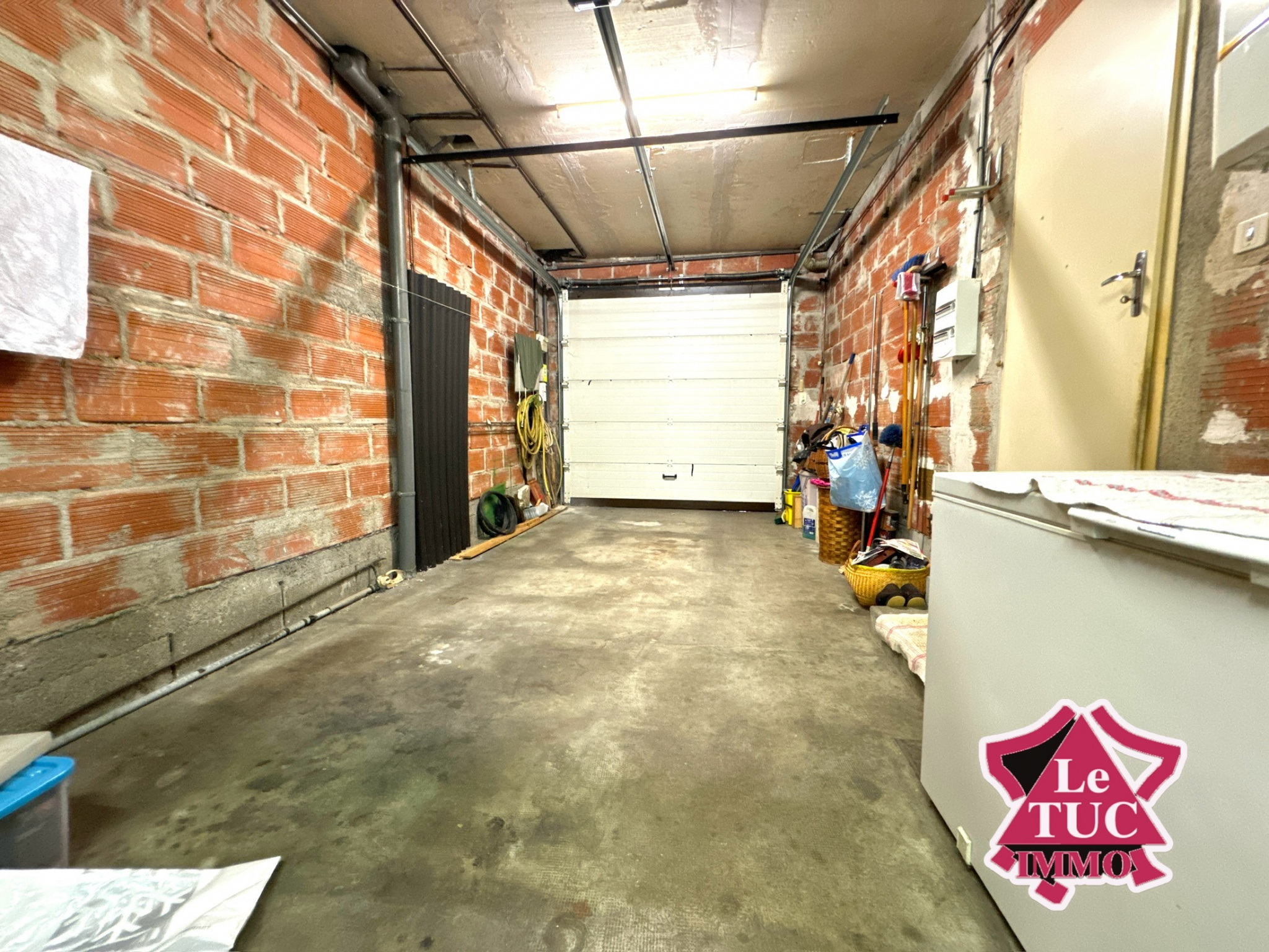 La maison dispose d’une entrée avec couloir sur cuisine de 13 m² avec accès au garage très confortable pouvant accueillir deux véhicules avec porte électrique, ainsi que d’un espace buanderie et chaufferie totalisant une surface de 35 m².