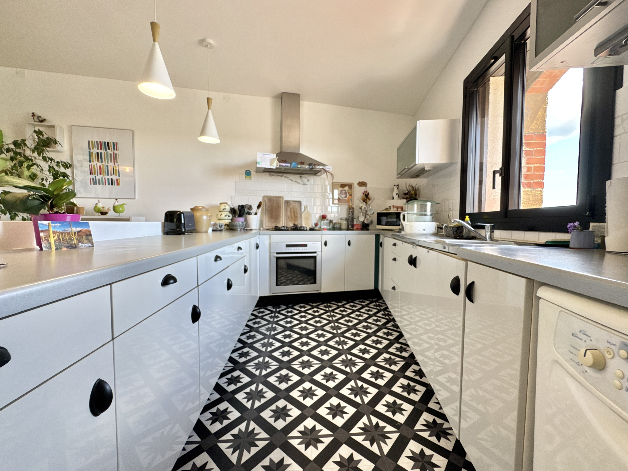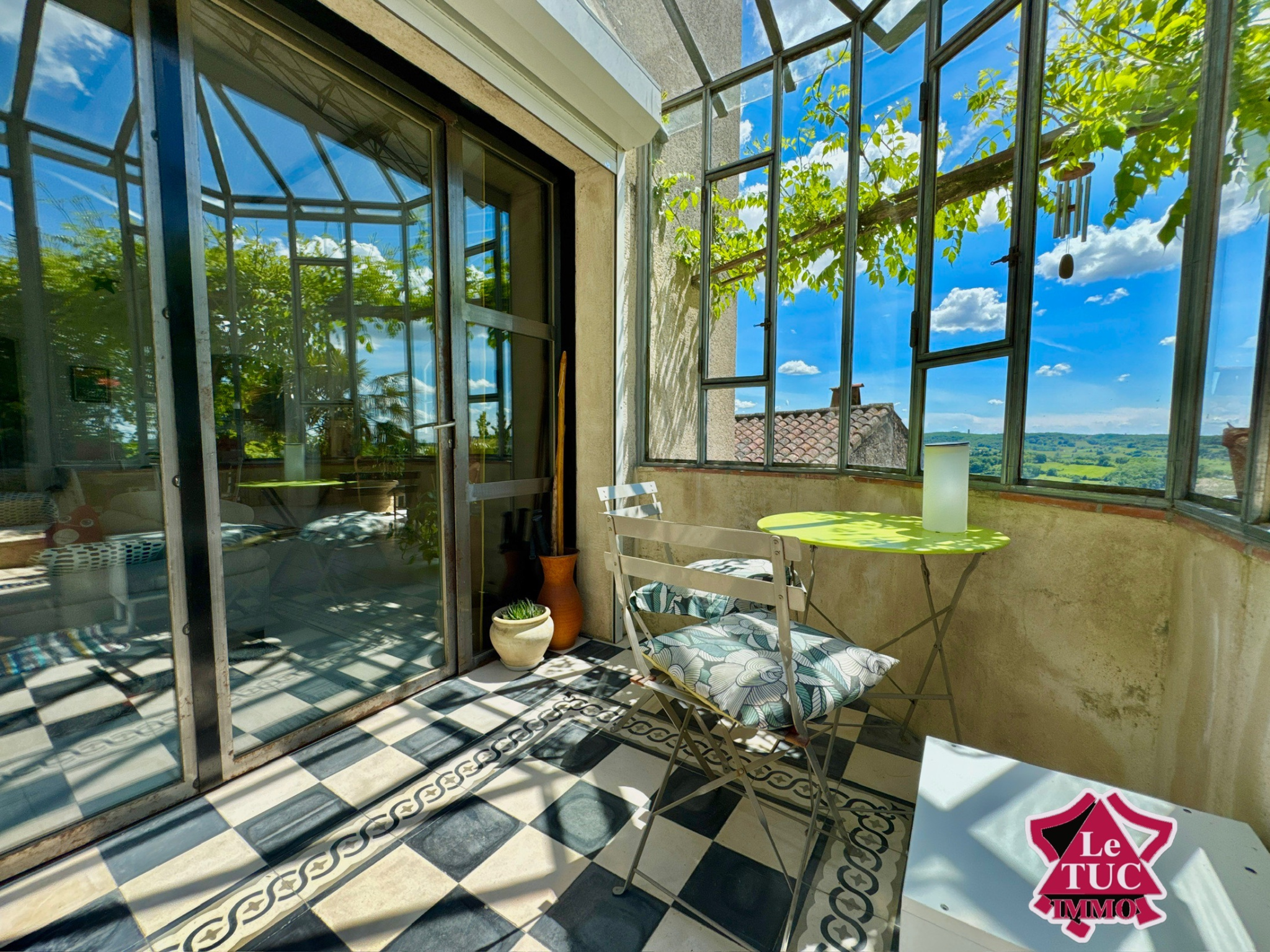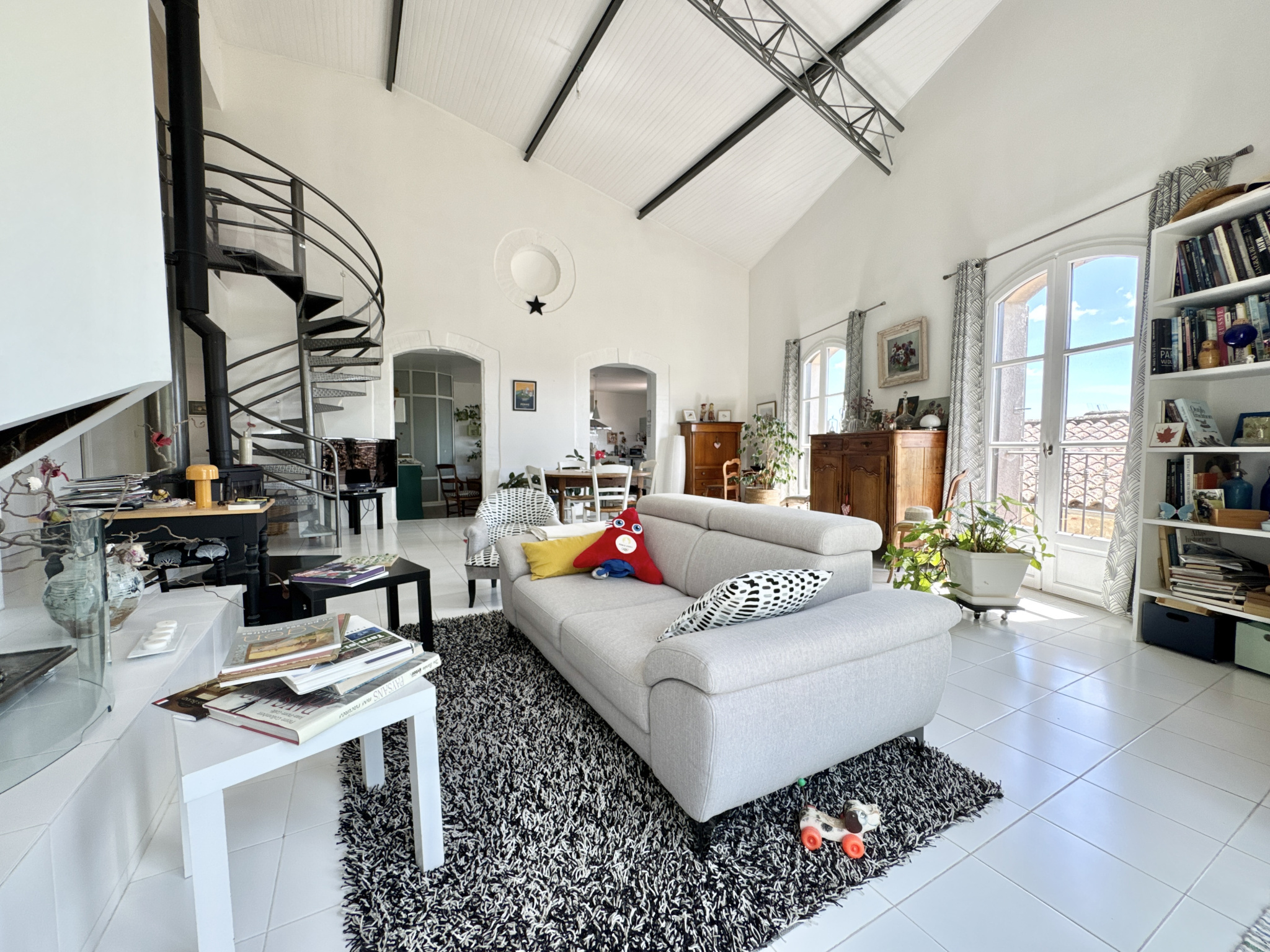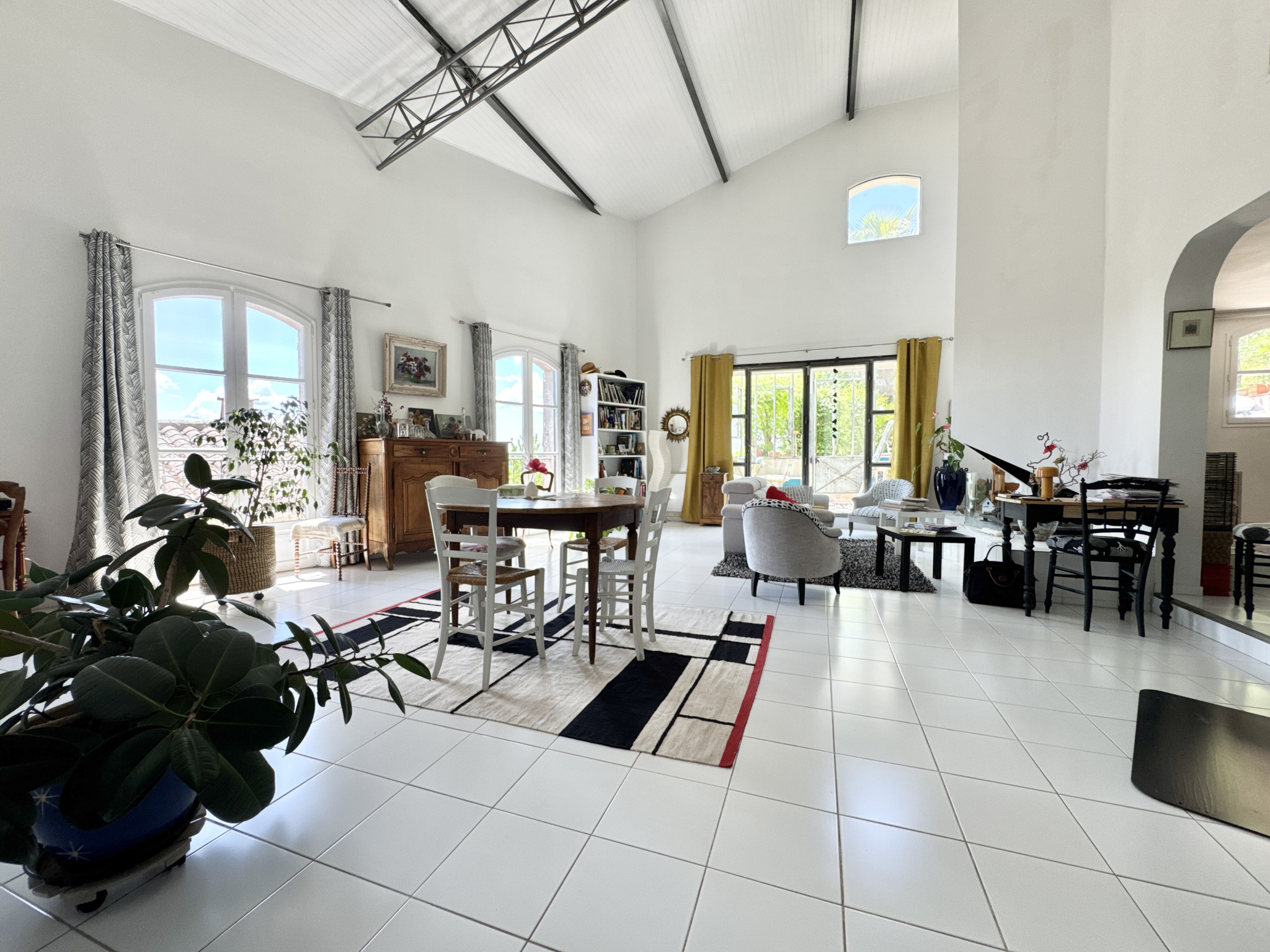 Comprenant une entrée avec verrière ou jardin d’hiver, donnant sur un double salon d’une surface de 72 m² avec cheminée ouverte et insert bois, avec des hauteurs impressionnantes grâce à une structure métallique de type industriel.