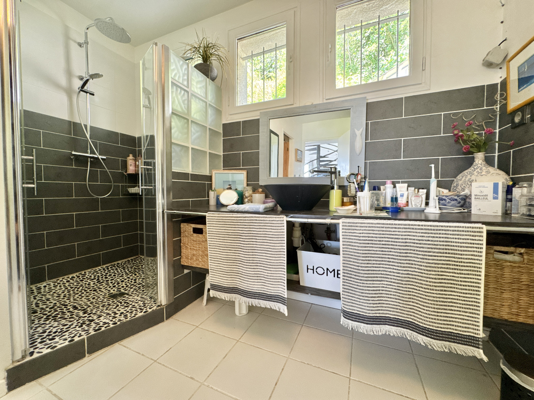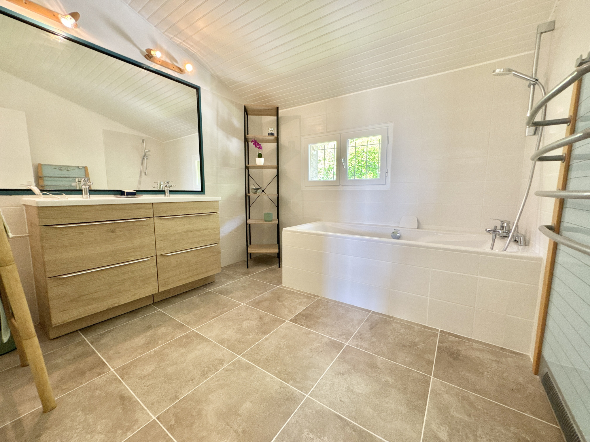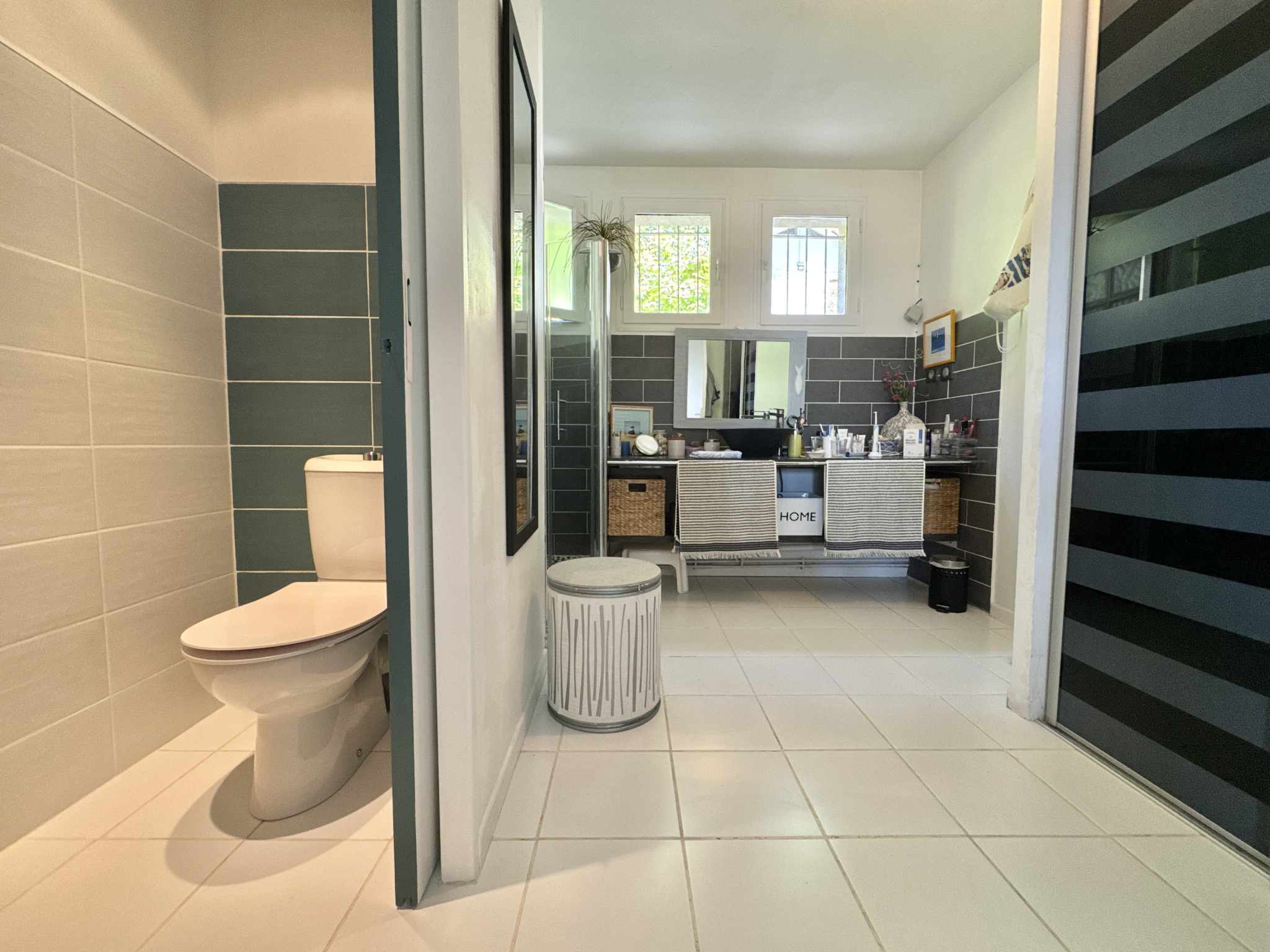 Une première salle d’eau rénovée avec douche italienne, WC, double vasque et placards.