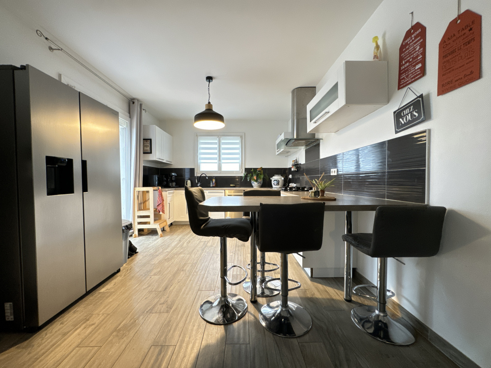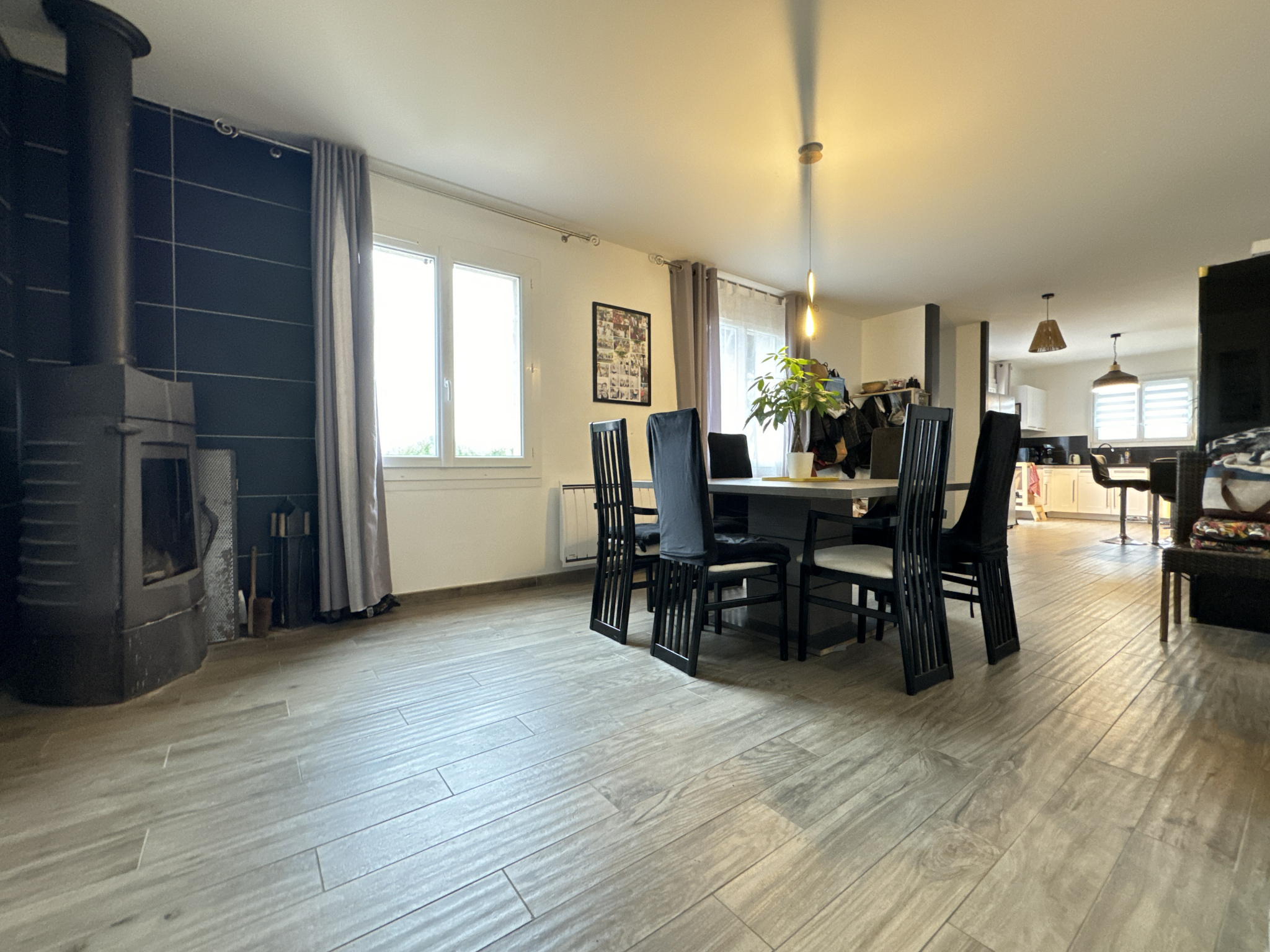 Côté maison, de nombreux travaux de rénovation ont été faits, notamment une belle cuisine américaine équipée de 13 m² donnant sur terrasse, une salle à manger de 27 m² avec poêle à bois, et un salon de 27 m².