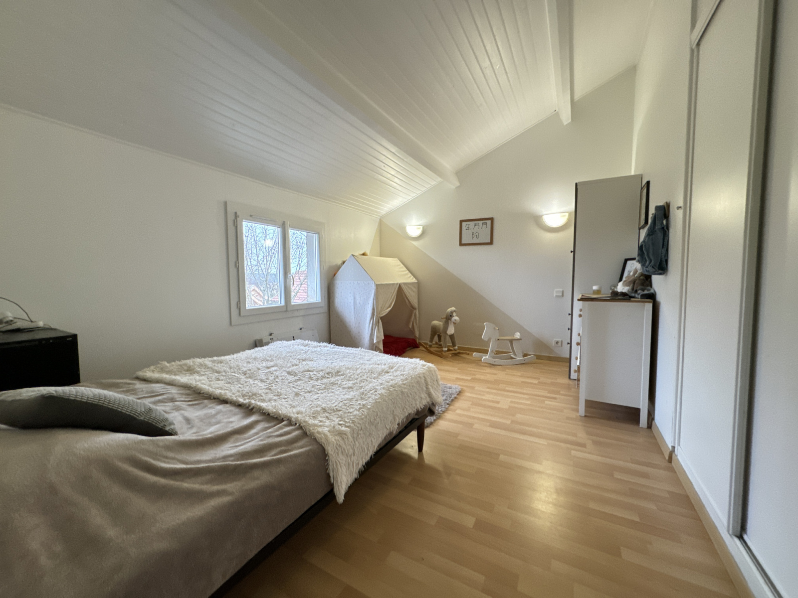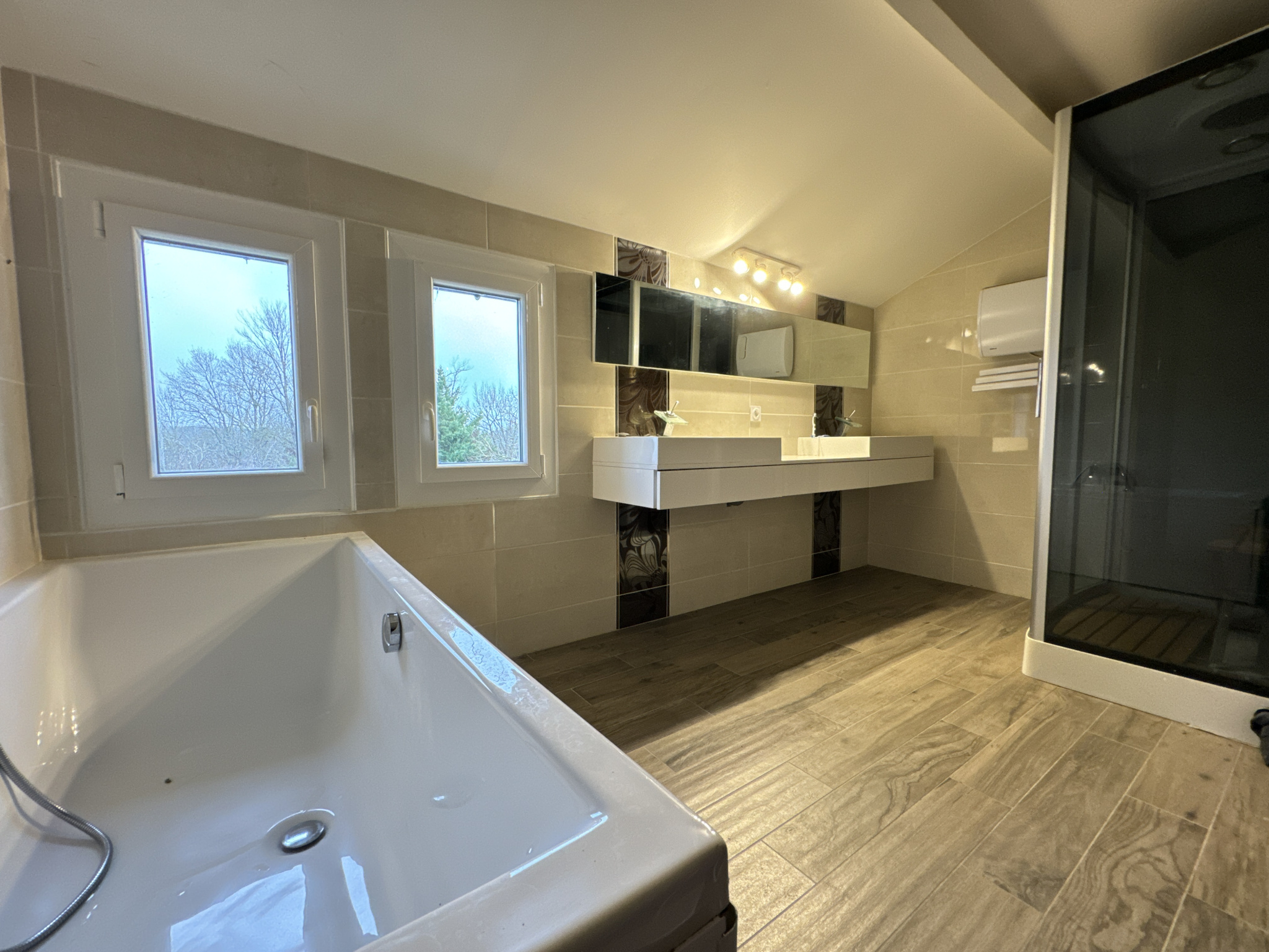 À l’étage, 4 chambres dont 2 avec climatisation réversible, un dressing de 11 m², ainsi qu’une salle de bain avec baignoire, douche et WC.