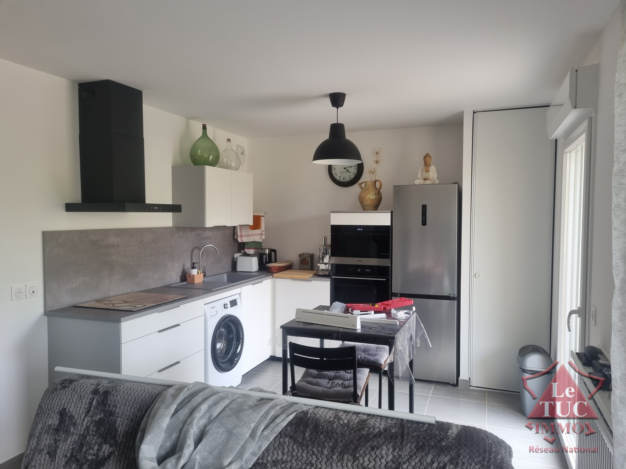 Agencement : Grande pièce de vie de plus de 24 m², cuisine entièrement équipée, salle d’eau